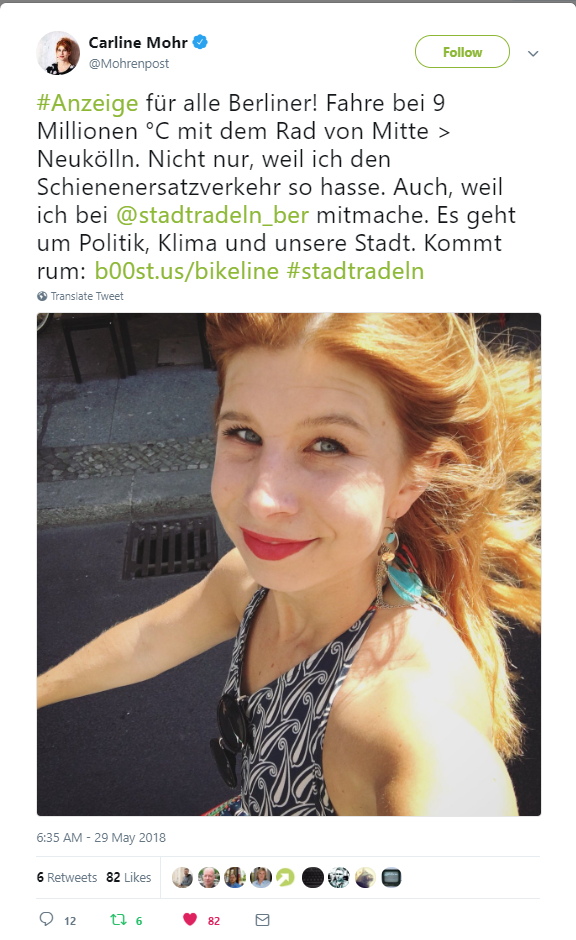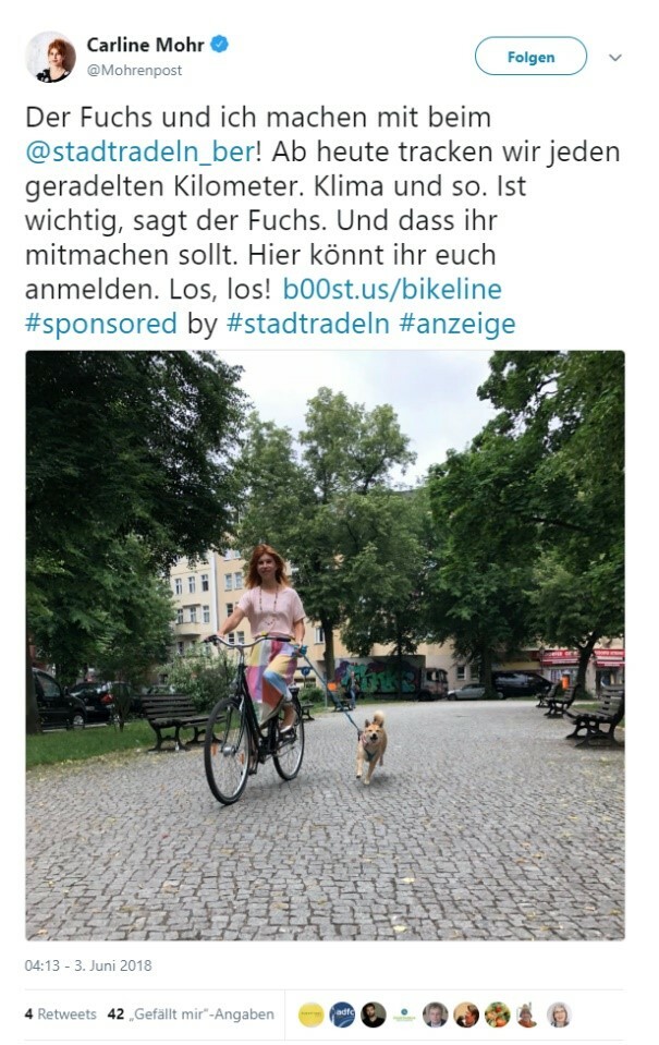 @Mohrenpost konnten wir eine begeisterte Fahrradfahrerin für unsere Kampagne gewinnen. Es wurde vor allem die Reichweite von mehr als 13.000 Followern auf Twitter genutzt.